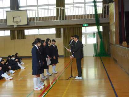 3月24日の修了式で、3月20日(日)に行われた第3ブロック女子バレーボール部1年生大会において2部優勝の表彰が行われました。バレーボール部員が2名のため、他の部員に協力を求め(ダンス部1名、吹奏楽部2名、硬式テニス部1名)で戦いました。練習時間確保が難しいなか、素晴らしいチームワークで優勝を勝ち取りました。味方のミスをチーム全員でカバーしあいながら、1点でも多く、相手チームより先に取ることができました。また、試合当日、2年生バレーボール部員7名全員が力強く応援してくれたので、とても1年生にとってパワーになりました。ありがとうございました。