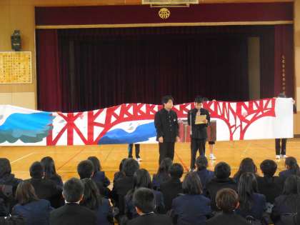 3番手は美術部です。2年生の部長が頑張って紹介してくれました。陸上部の手助けもあって、立派な作品の紹介もできました。
