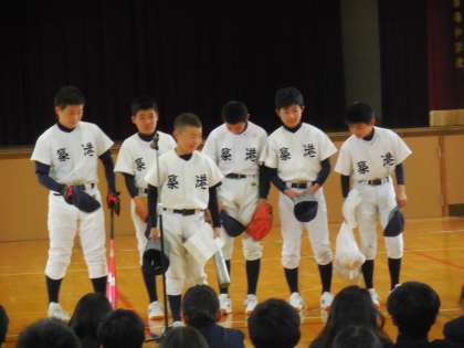 6番手は野球部です、雨天時の室内練習の様子を紹介してくれました。3年生の見事なバッティングに感嘆の声が上がっていました。