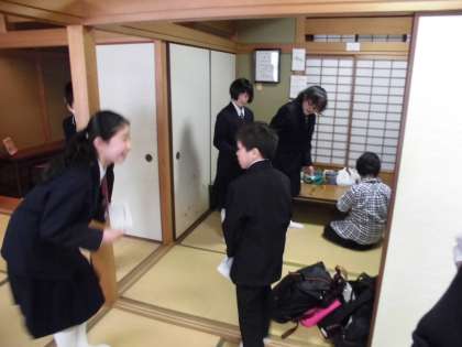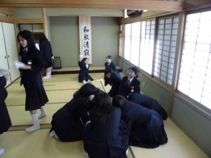 茶道部です。今日はなんと13名もの新入生が来てくれました。嬉しいのですが現場は大混乱です…こんなに多くの新入生がお茶菓子目当てに…いえいえ、茶道で礼儀作法を学ぼうと集まってくれたことに感謝です。