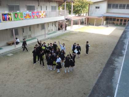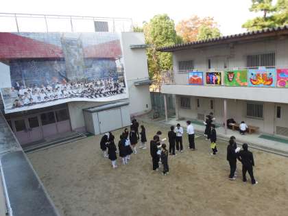 ◇中庭・クラブ室前(2年モザイク画、体育大会学級応援旗)