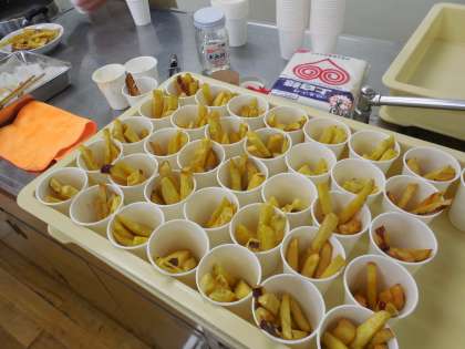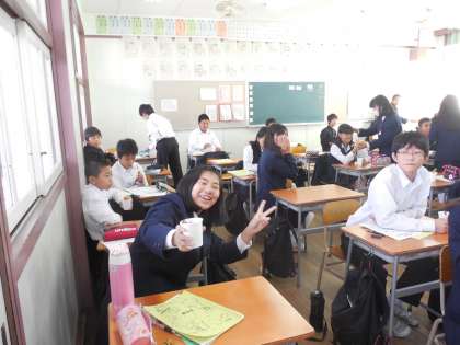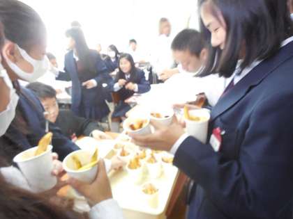 午前11時50分、各教室にボランティアの方々が「大学いも」を配布していただきました。築港中学校で出来たサツマイモが、こんなに美味しくいただけてとても喜んでいます。