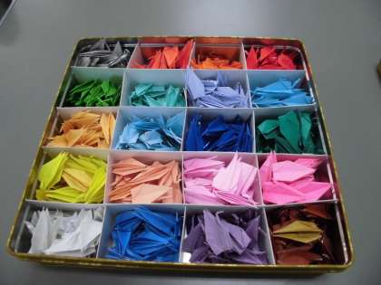 3年生の修学旅行で、広島に持っていく千羽鶴がもうすぐ完成をむかえています。総合の時間や朝の学活、昼休みや休み時間にみんなで折った鶴がついに千羽を超えました!3年生のみなさんお疲れ様でした。取り組みの意味をみなさんが理解してくれた上で、とても楽しそうに折ってくれたのが何よりも嬉しかったです。さあ、立派な千羽鶴を完成させましょう!