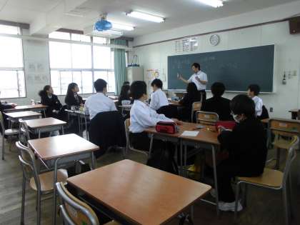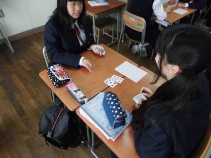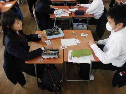 1年2組Bは数学で、内容は”正負の計算”です。2人〜3人のグループになって、トランプを使ってゲーム感覚で学習しています。お互いにカードを出し合い、黒のカードは正の数、赤のカードは負の数に見立てて、合計した数をどちらが速く答えるか競争をしています。みなさんとても楽しそうに取り組んでいました。