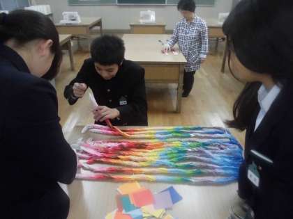 修学旅行で広島の原爆記念公園に奉納するため、みんなで協力して折った千羽鶴が、ボランティアの人たちのおかげでこんなに立派に完成しました!色のグラデーションがとても美しいですね。遅くまで残ってくれたみなさん、お疲れ様でした。