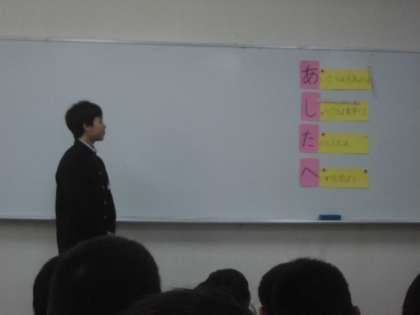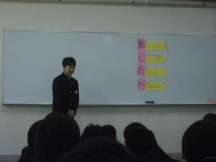 最後は委員長会の代表から、修学旅行のスローガンの紹介がありました。委員長4人で考えたスローガンは、