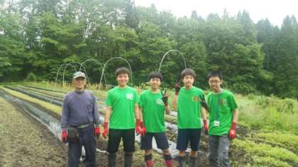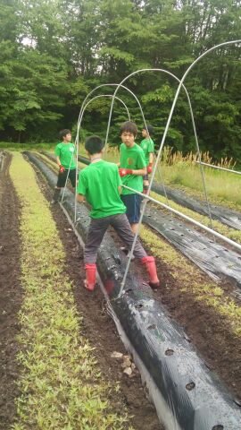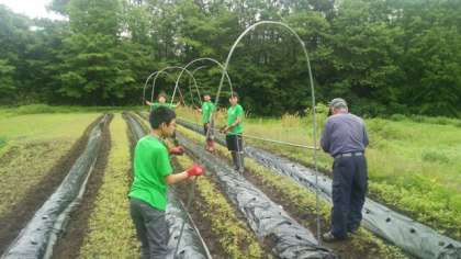 こちらも畑作業をしています。きゅうりを植えるためのネットを作っているところです。テキパキとした仕事ぶりに、服の色と同様に現地に溶け込んでいる様でした。