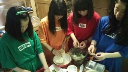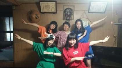 風呂上がりに着替えて現れたのは、築港中学校ゴレンジャーのみなさんです。安芸太田町の平和を守り、美味しい広島焼きを作ります。
