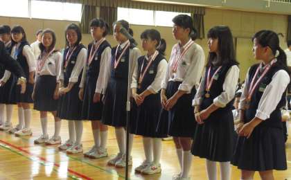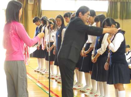 テニス部の表彰がありました。大阪市春季総合体育大会で見事3位に入賞しました。ピカピカのメダルを校長先生にかけてもらってうれしそうでした。