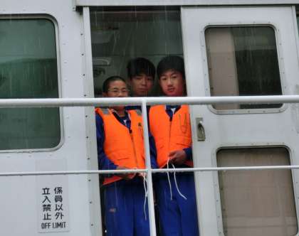 あいにくの雨模様。朝いちばんでタグボートに乗って岸壁から出発。