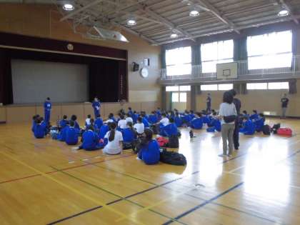 1年生が一泊移住に出発しました。体育館で出発式を行い、元気な顔でバスに乗りました。