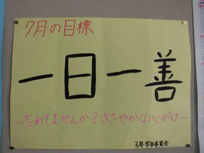 3年生の委員長会です。今月の学年目標を『一日一善』と決めました。夏休みにも入り、家族と過ごす時間も増えると思います。これを機に、毎日何か一つ良い事をしてみませんか?