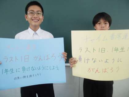 7月7日の生徒協議会で、体育委員会からの『プールの時に日焼け止めを塗らないでください』という提案と、チャイム着席運動の途中経過の発表がありました。それを受けて、委員長会は早速その後残ってポスターを作成し、明日学年のみんなに呼びかけをするそうです。自発的な活動にとても感心しました。これからも頑張ってください。