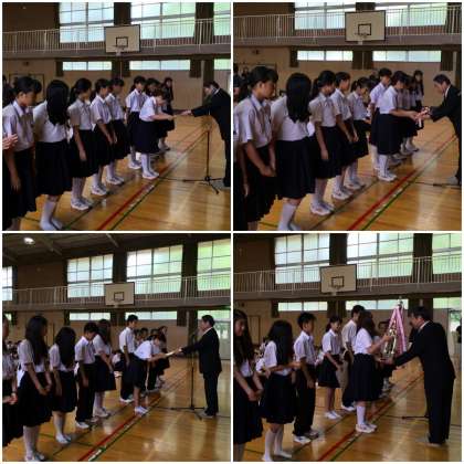 一方、校内活動として先週から取り組んでいたチャイム着席運動の表彰が行われました。こちらも1-2、3-1、3-2の3クラスがパーフェクト賞を獲得しました。その中でも3年2組はオールパーフェクトのスーパーパーフェクト賞に輝きました。校外でも校内でも、みんなの積極的な活動の成果を見ることが出来てとても誇らしい気持ちです。