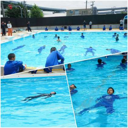 訓練では、冬用体操服上下を着用しての入水体験に、「動きにくい」「動いてもすぐ疲れる」など、水中での行動の困難さを体験し、また、助かるためには『浮き続ける』方法などを学びました。