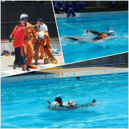 フル装備をした隊員の方の救援実演と矢田先生の演技、とても迫力がありました。