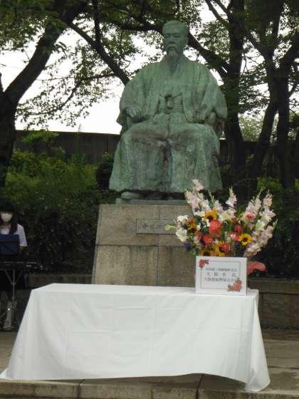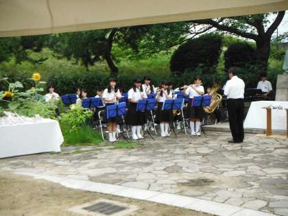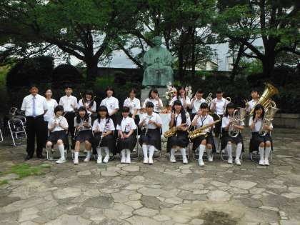 7月15日(金)は大阪港開港の日です。毎年この日に、初代大阪築港事務所長の「西村捨三翁」献花式が行われています。吹奏楽部は「銀河鉄道999」「築港らんらんらん」の2曲を演奏。特に「築港らんらんらん」は吹奏楽に編曲して2回目の演奏、歌も入れて参加者にも好評でした。引き続き献花式では「輝ける時」の演奏をしました。暑い中でしたが、がんばっていました。