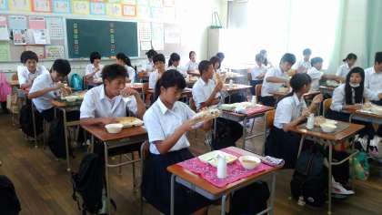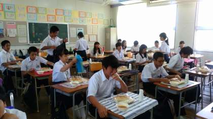 懐かしい給食。3年ぶりの給食を美味しそうに食べています。