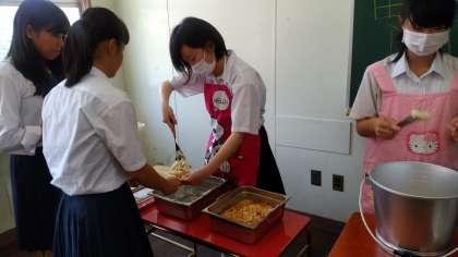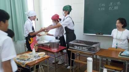 3年生の給食の配膳の様子です。小学校の時を思い出しながら上手に配膳をしています。