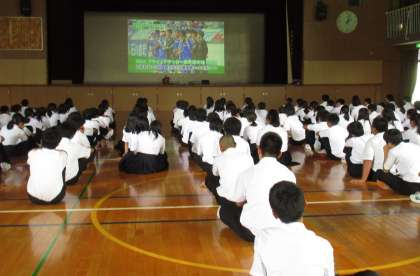 9月7日(水)に予定されているブランドサッカーの事前指導を6日(火)6限に体育館で全校一斉に行いました。日本ブラインドサッカー協会から送られてきた資料を基にブラインドサッカーの内容を映像でみました。樋口先生の説明を受け、教室で冊子のワークシート「みんなはどう思う?」(障害者について)に書き込みました。このブラインドサッカーは障害者を理解するための取り組みの一環です。