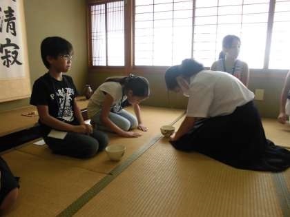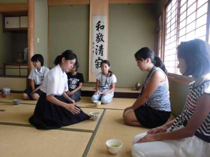 茶道部です。厳かな雰囲気の中、茶道を体験することができました。お茶は美味しかったですか?