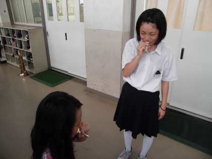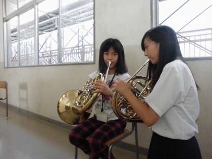 美術部と吹奏楽部です。美術部はイラスト体験、吹奏楽部は先輩に一人づつついてもらって、実際に演奏をしました。