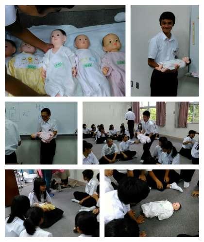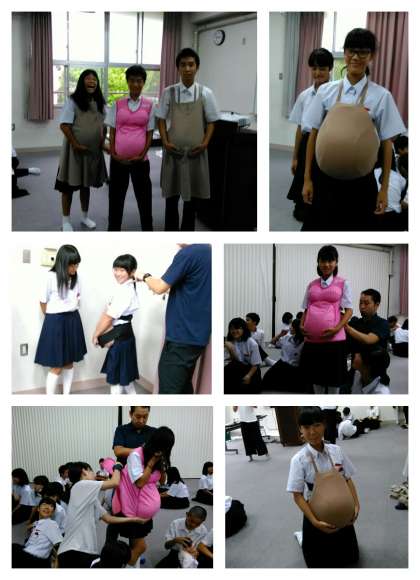 続いて6限、グループに分かれ、生まれたばかりの赤ちゃん人形を抱いたり、臨月のお母さんの身体を疑似体験したりしました。