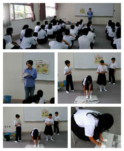 「足にフィットする靴の履き方“5ステップサイクル”」という方法を保健委員の実演を見ながら解説がありました。