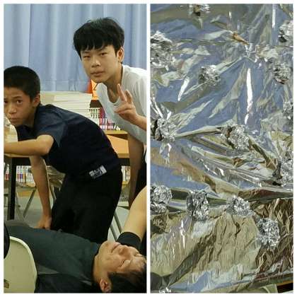 2年生の演劇には映像も絡みます。映像チームは限られた時間で80カットも撮影を繰り返しやっとクランクアップしました。宇宙の感じを出すためにアルミフォイルを背景に撮影しました。
