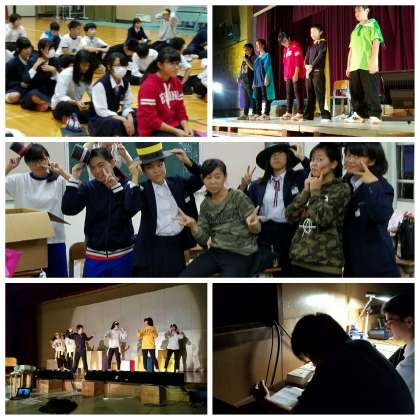 10月26日、27日と続けて2年生は舞台稽古をしました。大道具も衣装も着けての本番と同じような動きを練習します。映像も出来上がりました。膨大な量のセリフを覚えた人もいます。ダンスの練習もがんばりました。照明や音響のタイミング、幕の開閉、大道具の出し入れを調整しました。いよいよ明日は本番です。