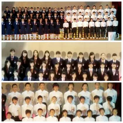 1年生学年全体合唱です。曲目は「怪獣のバラード」。手拍子が入ったり最後には右手を挙げて元気ようく歌いました。とてもきれいなハーモニーでした。
