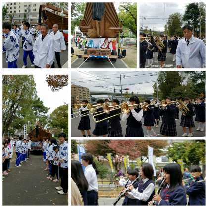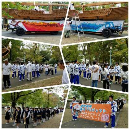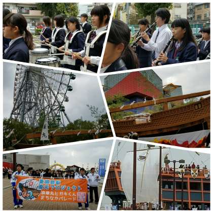 パレードの詳しい様子です。商店街や港大通りを過ぎ、最後は海遊館までパレードしました。菱垣廻船のハカマバナーは美術部制作で今年のテーマは「炎」と「水」です。パレードには剣道部の生徒も参加しました。