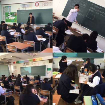 本日の2限目は、1組が数学。2組が英語です。1組の数学では、比例・反比例について学びました。2組の英語では、プロジェクターを使っての授業でした。その後はペアで教科書の読みあいでした。
