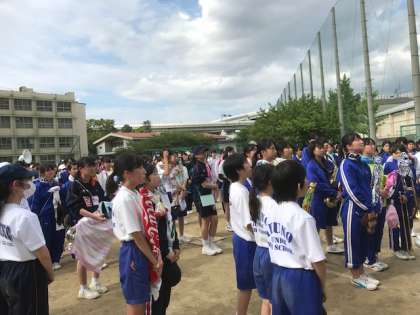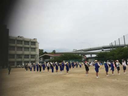 5月3日・4日、吹奏楽部は、本校で行われた3000人の吹奏楽大阪市立中学校合同バンドの練習に参加しました。「ゴジラのテーマ」「スーパーマリオブラザーズ」「いつも何度でも」「紅蓮の弓矢」の4曲を参加した9校350名と一緒に、運動場で隊形を変えながら演奏しました。会場校ということで朝早くから準備をしてくれた生徒達、お疲れ様でした様でした。