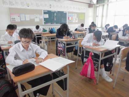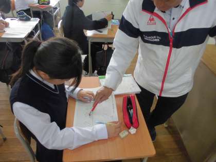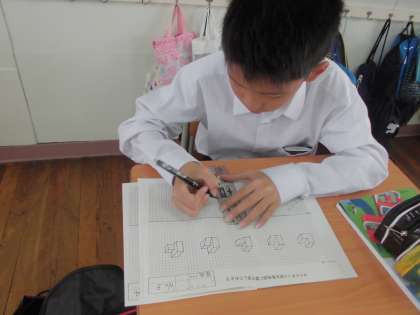 水曜日の1限目の様子です。立体を平面に、立体的に図示する”キャビネット図”の練習をしています。みんなとても集中していて、静かな雰囲気が漂っていました。