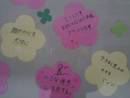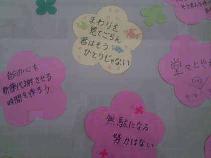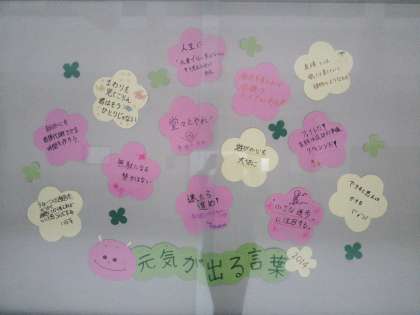 2月の保健員会では、「4月から新生活を元気に始められるよう、皆に明るい言葉をおくろう!」という目標で、元気の出る言葉をカードに書きました。カードは、保健室前の掲示板に貼りました。本からヒントを得て言葉を考えた人もいれば、自分で考えた言葉を書く人もいました。とても素敵な言葉をたくさん出してくれました。ぜひ、足を止めてひとつひとつ読んでみてくださいね。