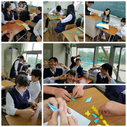 修学旅行の広島平和記念公園に奉納する折鶴の制作は計3時間かけて全員で取り組みました。最初はなかなかきれいに折れない生徒も多かったのですが、時間を追うごとにきれいに制作できていいました。平和の祈りを込めていい時間でした。