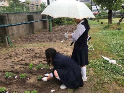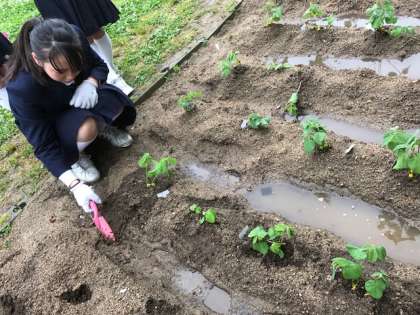 5月13日(土)土曜参観の1時間目、3年1組Aの技術の授業で「枝豆の定植」を行いました。あいにくの雨でしたが、生徒達は傘を差しながら、枝豆の苗を畑に植えました。