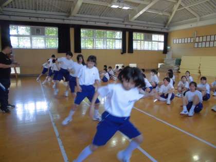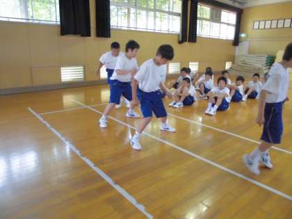 とても暑い日が続きますが、1年生は元気いっぱいです。今日の5限目は、腹筋と反復横跳びです。少しでもいい記録を出せるように、みんな真剣です。でも直前に給食をたくさん食べたので、少し苦しかったようです。
