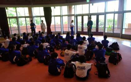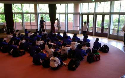 予定通り少年自然の家につき、オリエンテーションホールで職員の方に、代表生徒からあいさつをしました。