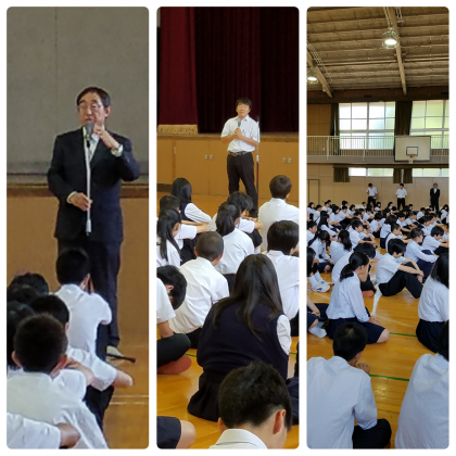 6月19日(月)朝の全校集会の様子です。校長先生からは、将棋の藤井さんの努力することが大切だというお話、堺先生からはウォータークーラーの使いかたや地域での遊び方の話がありました。