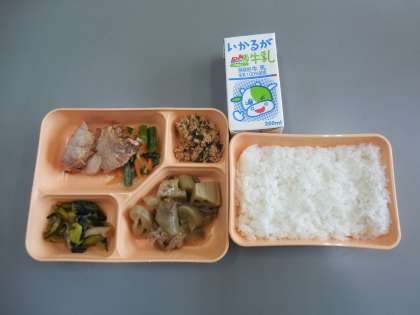 メニューは「鶏肉のしょうゆマヨネーズ焼き」「三度豆のみそ和え」「牛肉とれんこんの甘煮」「煮びたし」「鮭わかめそぼろ」でした。