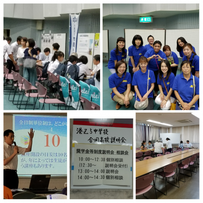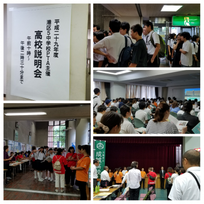 9月2日(土)は港区のPTA主催、五中合同高校説明会でした。朝10時から午後2時30分までプレゼン形式の説明とブース形式の説明会が行われました。開場とともに沢山の保護者や生徒が押し掛けました。それぞれのブースで熱心に話を聞いたりする姿が見受けられました。今年の築港中は2年生の生徒や保護者の参加が増えました。