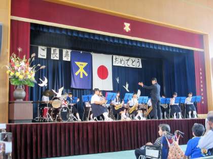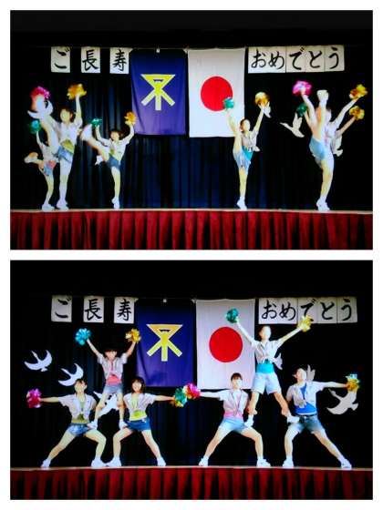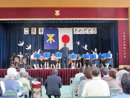 9月10日(日)、港晴小学校体育館で、「ご長寿お祝いの会」があり、第1部で吹奏楽部が演奏し、第2部でダンス部が出演しました。