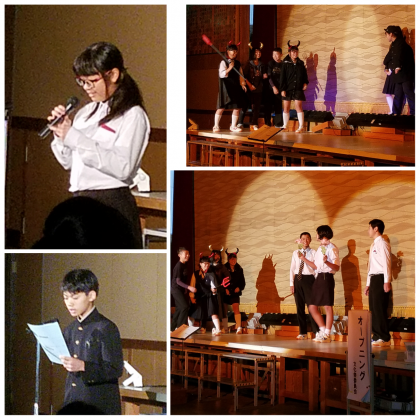 舞台の部の最初は文化祭委員会によるオープニングです。夏休み前から脚本を考え、少ない時間の中で練習をがんばってきました。最初の挨拶は後期生徒会長、鑑賞上の注意は文化祭委員長です。