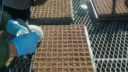 地域ボランティア5人、生徒3人、港・大正公園事務所の指導員2人合計10人が集まり鉢上げと播種(はしゅ)(種まき)をしました。
