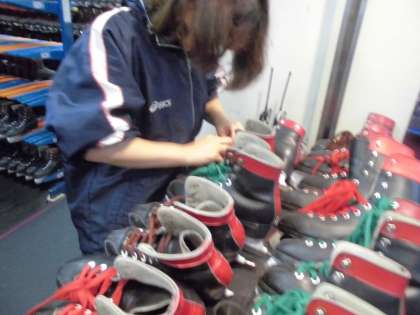 今年で4年目になるこのスケート教室、たくさんの方々のご協力があって開かれていることを忘れてはいけません。コーチの方はもちろん、いろいろな準備をしてくださった先生方、そして大阪プールのスタッフのみなさま、本当にありがとうございます。写真はみなさんが帰った後、すべての靴のひもを通し直し、次の講習のための準備をしてくださっているところです。有難いですね。