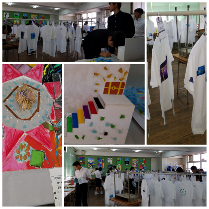 文化祭展示の部、美術科3年生パソコンプリントペーパーによるTシャツ、「今から未来への道筋」のパネル製作です。