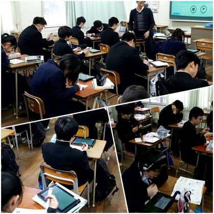 英語科では、英文読解の小テストをこなした後、個々にタブレット端末を用いて、リスニングスキルと音読スキルを強化する授業をされました。ヘッドセットから流れてくる会話文を何度も聞き取り、自分の音読を録音して聞き返すという新たな試みに挑戦していました。普段リスニングが苦手な生徒も、会話文を何度も聞きながら内容を把握し、自分たちで声に出して読むことで英語のスキルを磨いていました。