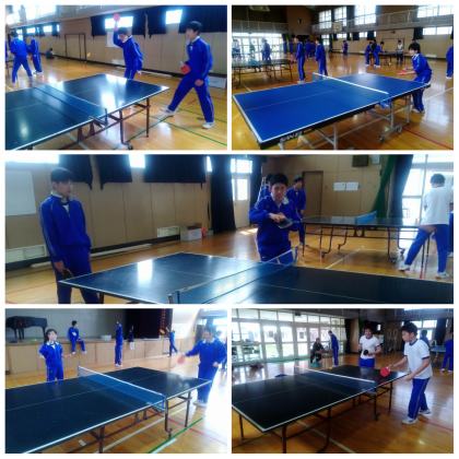 3年生は2月28日(水)の午後から体育館で卓球大会を行いました。受検前ですが、ストレス発散でとても盛り上がりました。男子はペアで、女子はシングルで戦いました。たくさんの試合数をこなし、なんと1点差で1組が勝利しました。男子は1組ペア、女子は2組シングル優勝です。